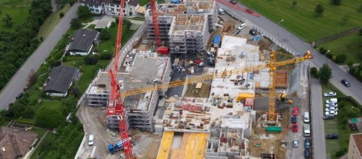 Baugrube: Die ca. 190m lange und 80m breite Baugrube konnte grösstenteils frei geböscht werden. Im Südwesten wurde zur Grundsteinstrasse hin eine frei auskragende, ca. 4.5m hohe und rund 70m lange Rühlwand erstellt. Die Gebäude konnten flach fundiert werden. Hochbau: Bei dem Neubau handelt sich um fünf Mehrfamilienhäuser in Massivbau, bestehend aus je einem bis zwei Untergeschossen und vier bis fünf Obergeschossen. Die Überbauung steht teilweise auf einer gemeinsamen Tiefgarage mit zwei Niveaus und ca. 140 Einstellplätzen.. Die horizontalen Tragelemente bestehen aus schlaff bewehrten Stahlbetondecken, die vertikalen Tragelemente aus Stahlbeton- und Mauerwerkswänden sowie vorfabrizierten Stahl- und Stahlbetonstützen. Ab dem Erdgeschoss wurde ein Grossteil des Tragwerks mit Elementwänden und -decken erstellt.