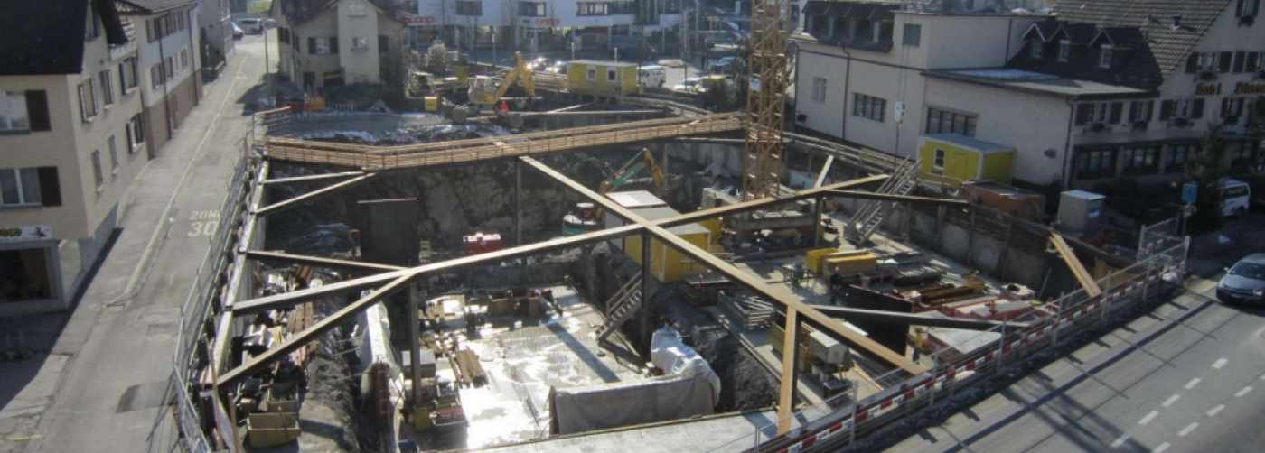 Zentrum Churerstrasse / Rebstockstrasse, 8808 Pfäffikon, Projekt und Bauleitung Baugrube mit Rühlwand und teilweiser Pfahlfundation