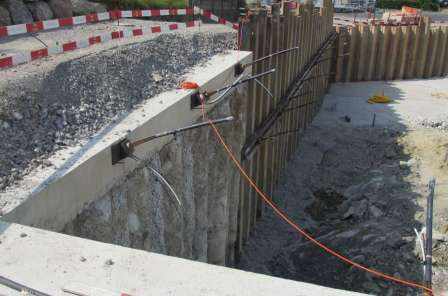 Der südwestliche Bereich der Baugrube, welcher bis zu neun Meter tief ist, musste mit einer rückverankerten, überschnittenen Bohrpfahlwand erstellt werden. Die Sicherung westlich und nordwestlich der Baugrube konnte mit einer rückverankerten, resp. frei auskragenden Spundwand erstellt werden. Die restlichen Bereiche konnten frei geböscht werden, teilweise mit Geröllbetonauflage.