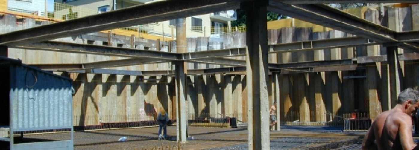 Gegenseitig ausgesteifte Baugrube für 2 Untergeschosse. Gegenseitg ausgesteifte Spundwand. Grundwasserabsenkung mit Filterbrunnen. Pfählung mit Ortbetonbohrpfählen D 600mm und D 900 mm.