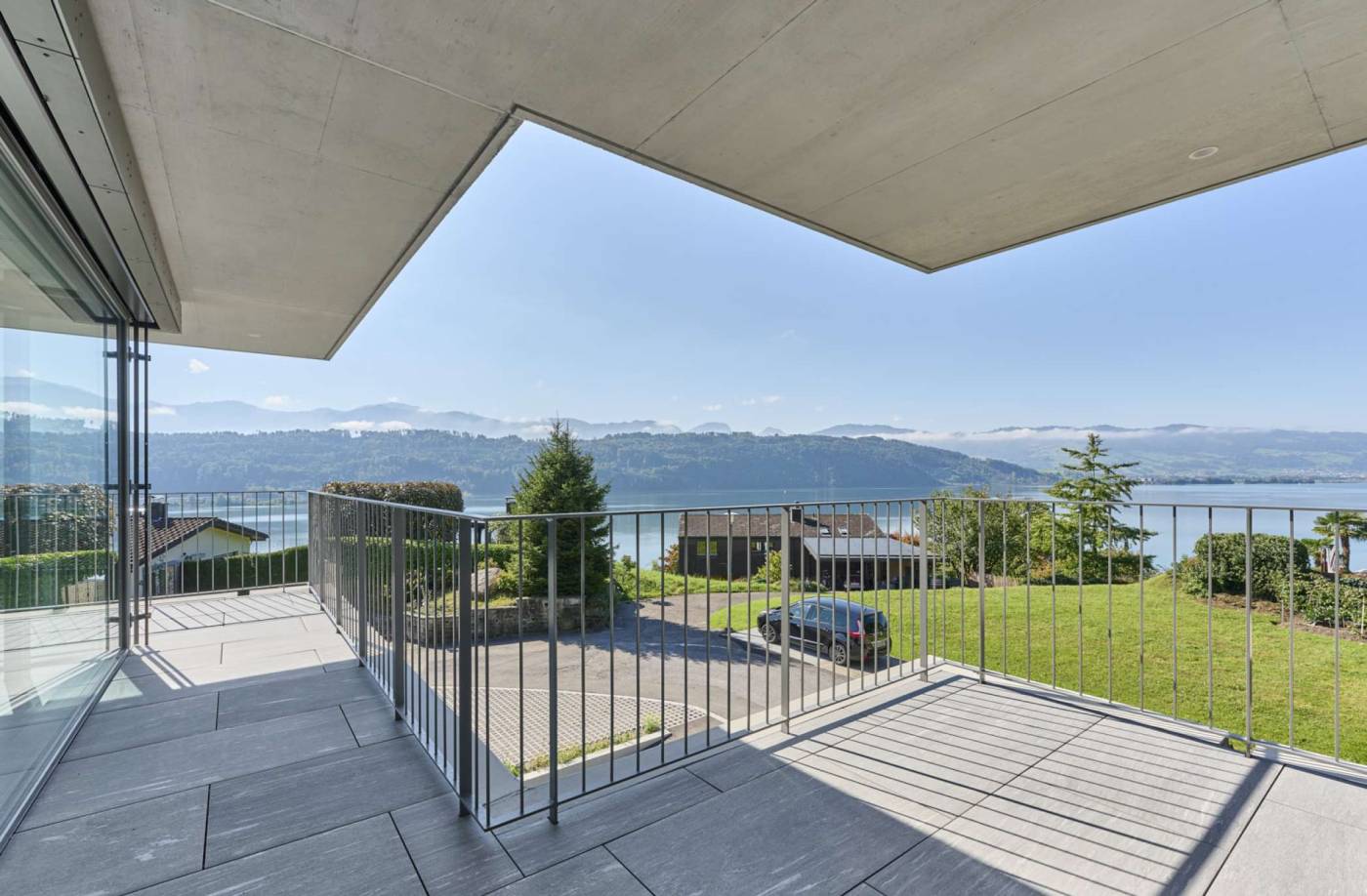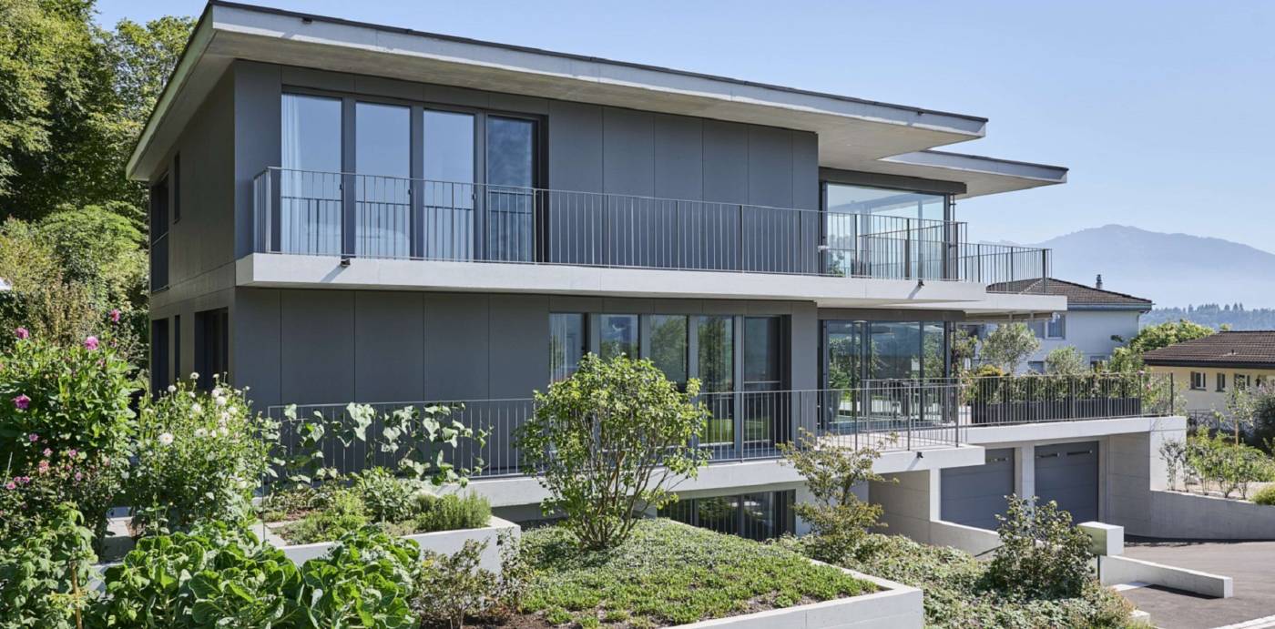 Das Bijou befindet sich in exzellenter Hanglage am Waldrand mit Sicht auf den Zürichsee. das dreistöckige Einfamilienhaus hat höchste Ansprüche an die architektonische Gestaltung. Grosse Spannweiten, weitauskragende Vordächer und Balkone, sowie grosse Fensterfronten kennzeichnen die Architektur.