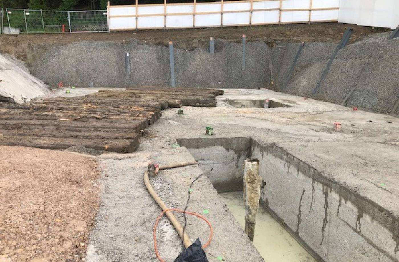 Eine Pfahlfundation gewährleistet eine sichere Fundation in einem eher schlechten Boden. Die Baugrubensicherung bestand aus einer Baumeister-Rühlwand.