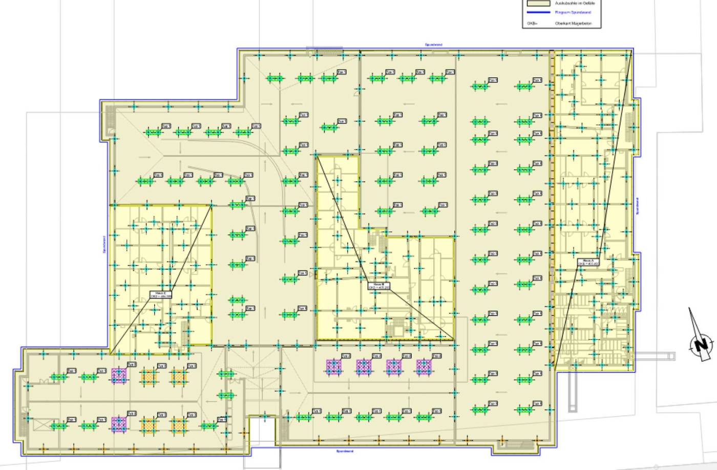 Die erste Etappe der Wohnüberbauung in Lachen umfasst drei Wohngebäude mit ca. 80 Wohnungen. Diese vier- bis fünfstöckigen Gebäude sind in Holzbauweise angedacht und weisen eine gemeinsame Tiefgarage auf. Aufgrund der vorhandenen Geologie ist eine Pfahlfundation vorgesehen. Für den Holzbau wird ein geeignetes Tragwerkskonzept erstellt und weiteres Optimierungspotenzial aufgezeigt. Dabei spiel die Wirtshaftlichkeit eine grosse Rolle. Mittels den Hochbaulasten konnte die Tiefgarage dimensioniert und das Fundationskonzept erarbeitet werden. Einen bereits ausführlichen Pfahlplan liefert nun die Basis für die weitere Baueingabe.