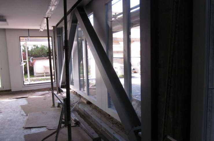 Im Zusammenhang mit der Gesamtsanierung wurde der viergeschossige Westtrakt des 1977 erstellten Mehrzweckgebäudes Bollwies hinsichtlich Erdbebensicherheit überprüft. Dieser ist von den übrigen Gebäuden dilatiert und muss die Erdbebensicherheit als Einzelgebäude erfüllen. Die horizontalen Tragelemente bestehen aus schlaff bewehrten Betonplatten und die vertikalen aus Stützen in den unteren zwei, sowie aus Mauerwerkswänden in den oberen zwei Geschossen. In diesem Gebäude ist die Führung der Feuerwehr Rapperswil-Jona stationiert und es muss deshalb der Bauwerksklasse III "Lebenswichtige Infrastrukturen" zugeordnet werden. Zur Erdbebenertüchtigung mussten sprengwerkartige Stahlfachwerke eingebaut werden, die teilweise im Fensterbereich sichtbar sind.