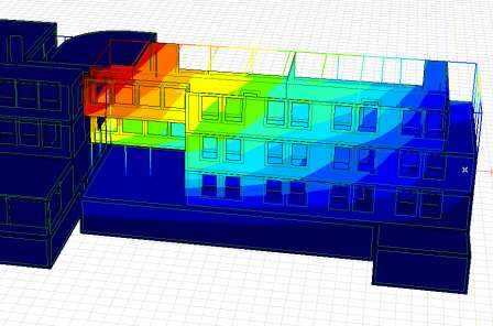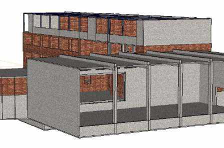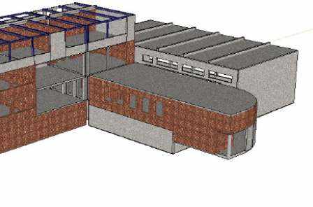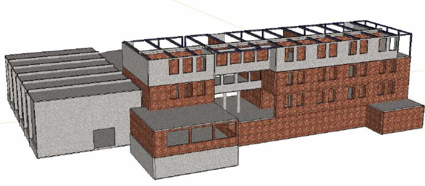 Das Gebäude mit mehreren Gebäudeteilen wurde anfangs der 1990er Jahre saniert und erweitert. Der rechteckförmige Baukörper des ältesten Gebäudebereiches besteht aus 4 Geschossen. Die Grundabmessungen der Turnhalle betragen ca. 13m x 25m. Die Gebäudeteile sind direkt aneinander gebaut, sind jedoch durch eine Dilatationsfuge getrennt. Für die Berechnungen und Nachweise des dynamischen Tragwerkverhaltens (Erdbeben) werden die vier Gebäudeteile zusammen betrachtet. Die Lasten werden bei allen Gebäudeteilen über die Stützen und die Wandsegmente bis in den Baugrund abgetragen. Das Gebäude ist durch eine Pfählung fundiert.
