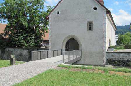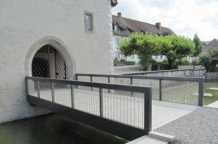 Ersatz der bestehenden Holzbrücke durch eine Stahlkonstruktion. Infolge der speziellen historischen Umgebung hat die Bauherrschaft einen Brückenbelag mit Sandsteinplatten gewählt, welcher spezielle Anforderungen an Planung und Realisierung gestellt hat.