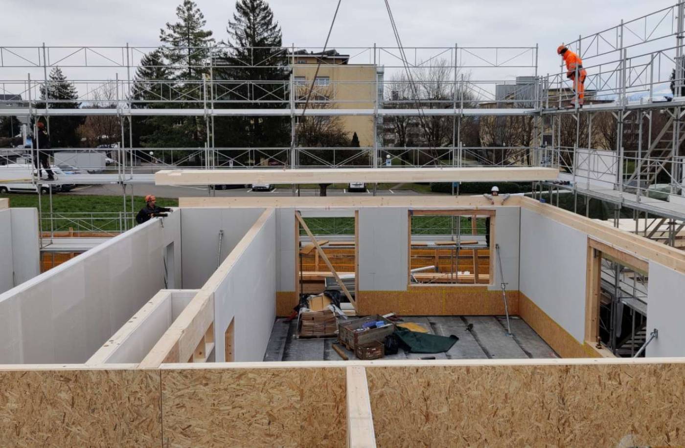 Aufgrund der geringen Lasten des Holzbaus, bestehend aus einer Rahmenbauweise und Kastenelementen, konnte die Fundation einfach gehalten werden und musste nur lokal mit Fundationsriegel verstärkt werden.
