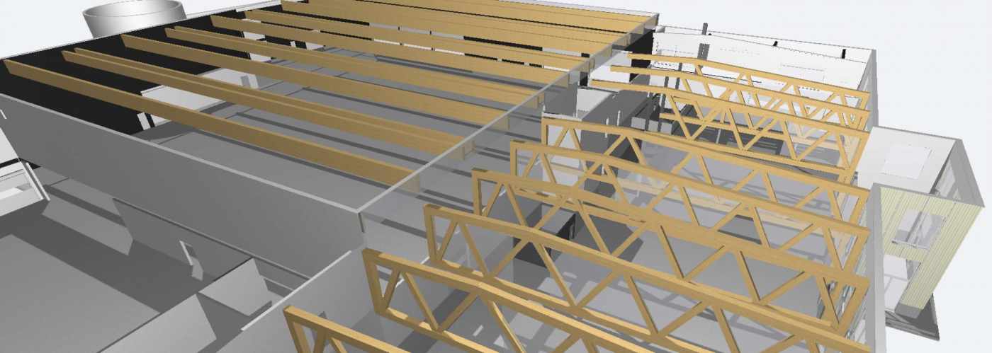 Die 25 m überspannte Schreinerei, über der sich die Büroeinheiten befinden, konnte mit raumhohen Fachwerkträger stützenfrei gestaltet werden. Die Fachwerke konnte duch eine frühes Mitwirken des Ingeneiur optimal in die Raumgestalltung integriert werden.
