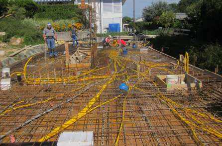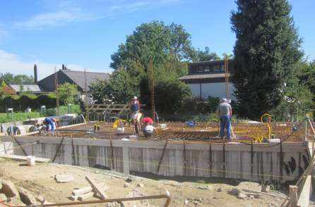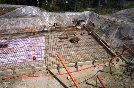 Neubau Einfamilienhaus, teilweise unterkellert. Teilbereiche der Bodenplatte stehen auf einer Polystyrol-Dämmung. Die nicht unterkellerten Bereiche des Gebäudes sind mit Magerbetontatzen auf dasselbe Niveau fundiert wie das Untergeschoss.
