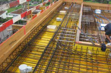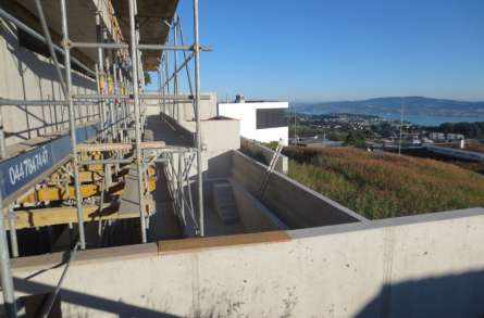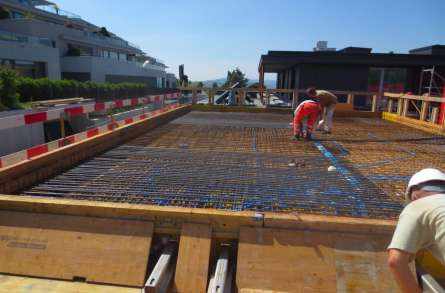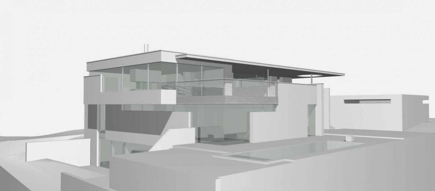 Bei dem Neubau handelt es sich um ein Einfamilienhaus in Massivbau bestehend aus einem Unter-, einem Erd- und einem Obergeschoss. Die Grundrissabmessungen im Erdgeschoss betragen ca. 21x27m. Die horizontalen Tragelemente bestehen aus schlaff bewehrten Stahlbetondecken und einem vorgespannten Vordach, die vertikalen Tragelemente aus Stahlbeton- und Mauerwerkswänden sowie vorfabrizierten Stahlstützen.