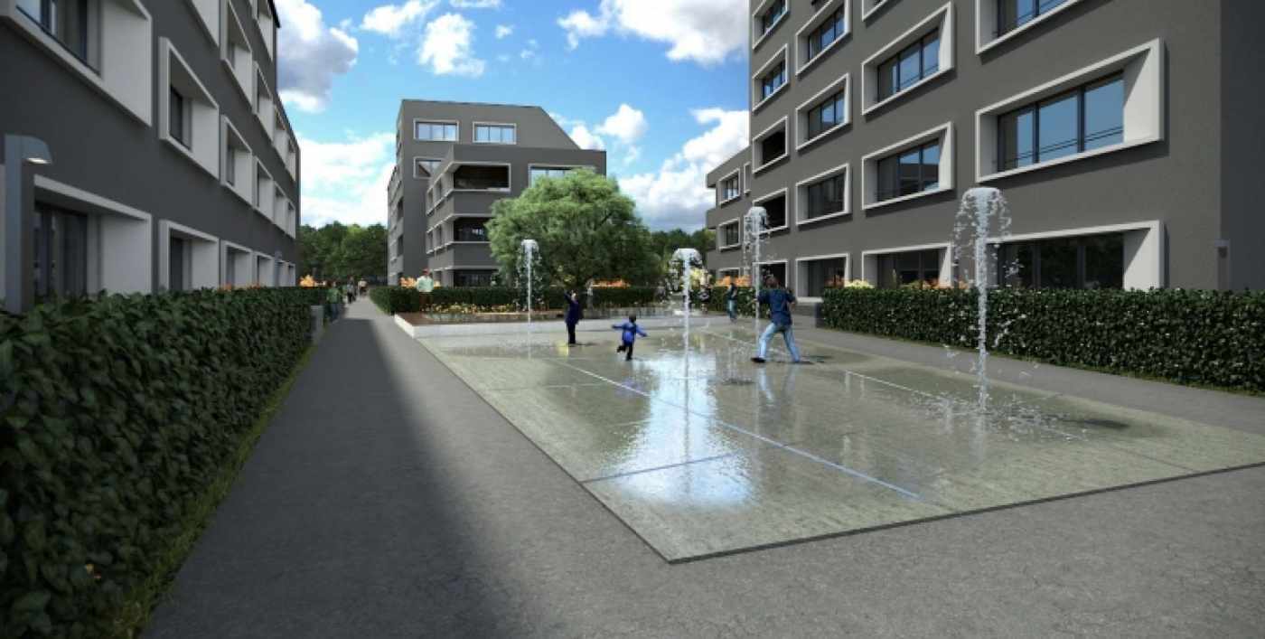 Hochbau: Auf einer Grundstücksfläche von rund 3500 m2 werden drei Mehrfamilienhäuser realisiert. Die drei Wohnbauten sind durch eine gemeinsame Tiefgarage miteinander verbunden.