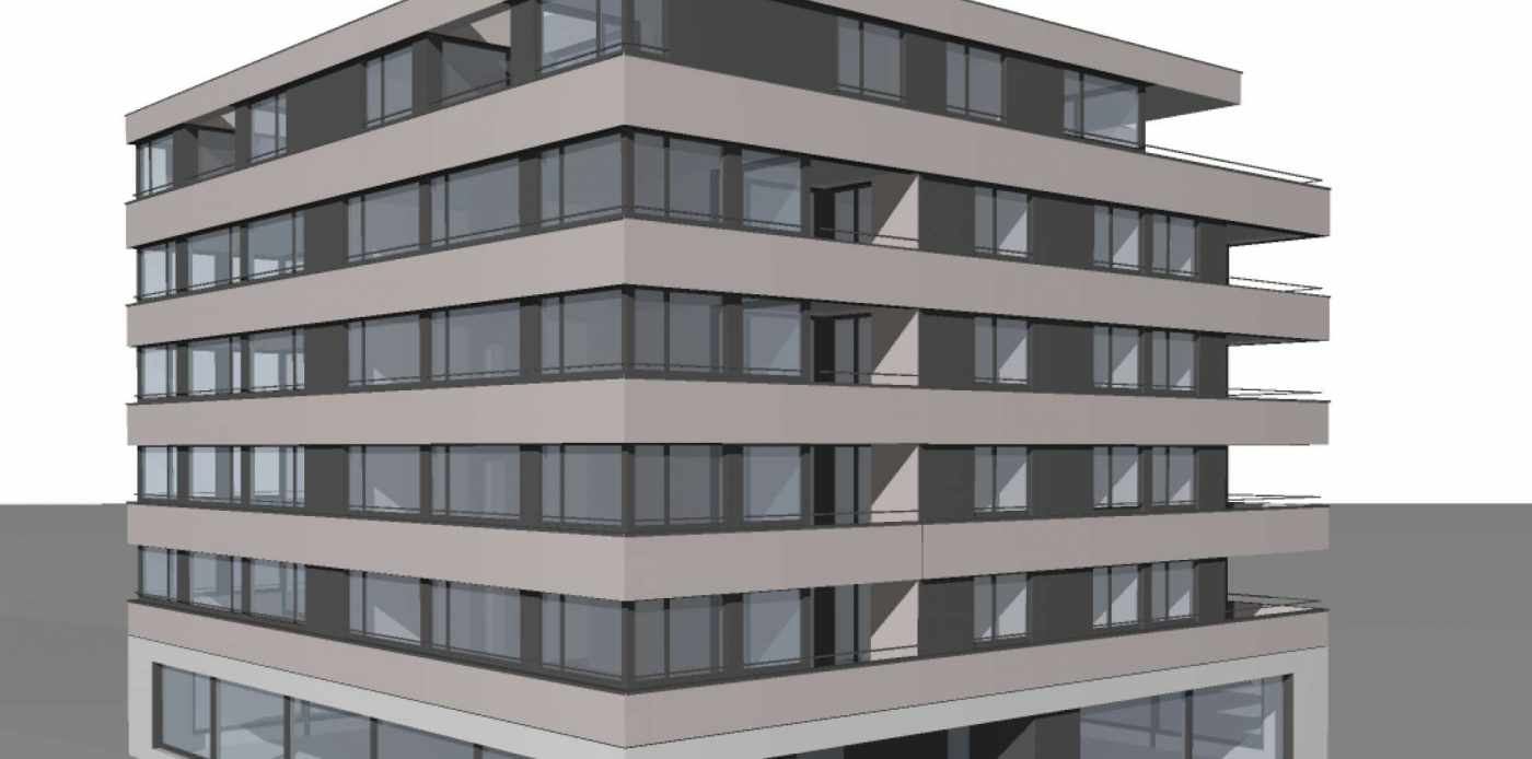 Auf dem ehemaligen Gelände der Oskar Rüegg AG entsteht ein Wohn- und Geschäftshaus in Massivbau, bestehend aus einem Untergeschoss, einem Erdgeschoss, vier Obergeschossen und einem Attikageschoss. Das Untergeschoss mit der integrierten Tiefgarage verfügt über Abmessungen von ca. 55 x 48m, das Erdgeschoss sowie die Obergeschosse weisen eine quadratische Grundrissform mit den Abmessungenvon ca. 25 x 25m auf. Aufgrund des schlecht tragfähigen Baugrundes wurde das Gebäude mittels vorgefertigten Betonrammpfählen fundiert.