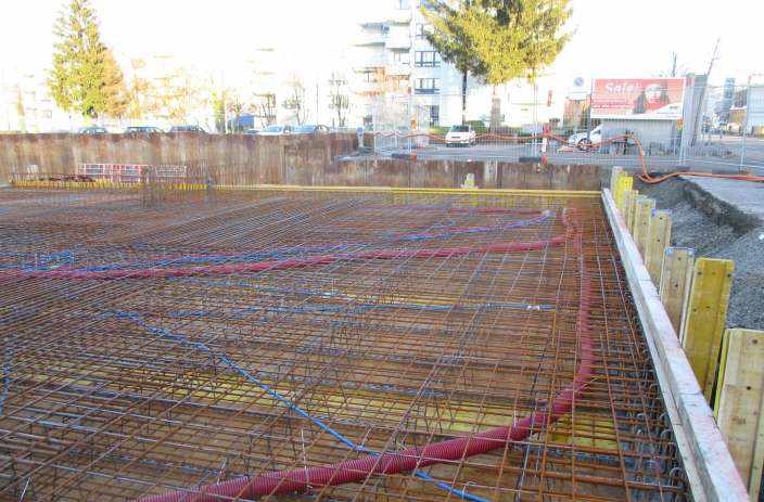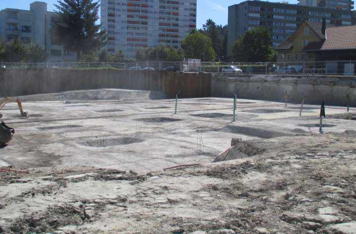 Beim Aushub wurden ca. 10'000m3 Erdmaterial abtransportiert oder auf der Baustelle deponiert. Aufgrund der beschränkten Platzverhältnisse auf der Ostseite kam eine Spundwand zur Anwendung.