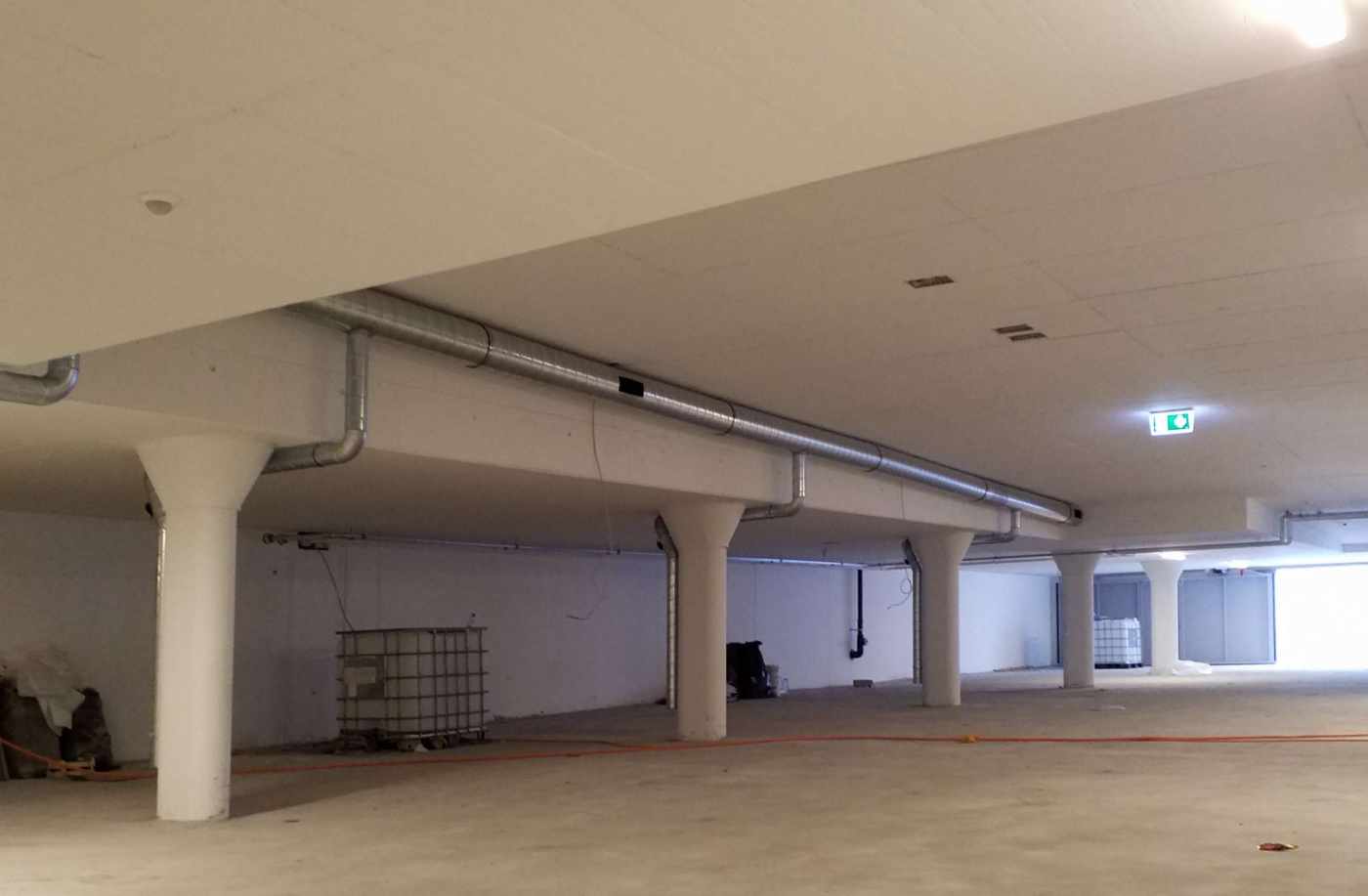 Die Gebäude stehen auf einem gemeinsamen Untergeschoss, welches die Einstellhalle, einen Schutzraum sowie Keller- und Technikräume enthält. Im EG weisen die Gebäude eine Grundrissabmessung von ca. 16.5 x 21.0 m auf. Das Bauvorhaben wird auf Pfählen fundiert. Im UG bestehen die horizontalen Tragelemente aus schlaff bewehrten Stahlbetondecken, die vertikalen Tragelemente aus Stahlbeton- und Mauerwerkswänden sowie vorfabrizierten Stahlbetonstützen. In den darüber liegenden Geschossen der einzelnen Häuser ist jeweils nur der Erschliessungskern mit Treppenhaus und Liftschacht in Massivbau (Beton).