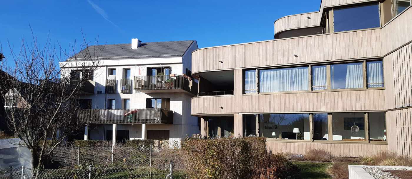 An der Seidengasse musste der ortsbildgeschützte Kubus des alten Gebäudes übernommen werden. Die Architekten haben einen Sichtbetonbau in Misapor-Dämmbeton vorgeschlagen. Die Südfassade mit grossen Fenstern wurde einschalig betoniert, bei den weiteren drei Fassaden kam das Kerndämmsystem mit mittig einbetonierter Dämmung zum Einsatz. Die Fassadenwände sind innen und aussen in Sichtbeton ausgeführt. Angrenzend entstand ein konventionelles Mehrfamilienhaus mit einer hinterlüfteten Fassade und gerundeten Balkonen. Beide Gebäude stehen auf der gemeinsamen Tiefgaragen, welche mit Injektionsrammpfählen auf den 8 bis 17 Meter unter Terrain liegenden Fels fundiert ist. Die Baugrube wurde entlang der Seidengasse sowie südseitig zum nahen Durchgangsweg mit einer gespriessten Rühlwand gesichert.