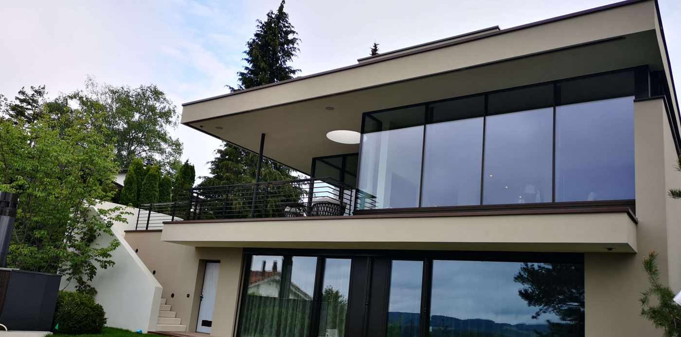 Die dreistöckige "High End Villa" hat höchtste Ansprüche an die architektonische Gestaltung. Grosse Spannweiten, weit auskragende Vordächer und grosse Fensterfronten kennzeichnen die Architektur. Die Baugrubensicherung bestand aus einer vertikalen Rühlwand. Die Fundation wurde mit Injektionsrammpfählen gelöst, da aufgrund der Hanglage die tragfähige Bodenschicht stark abfällt. Die Aussenlage besteht aus einem Sichtbeton-Pool, einer Pergola und einem Cheminée. Diese Sichtbeonbauteile sind in Ammocret®-Kalksteinbetonausgeführt.