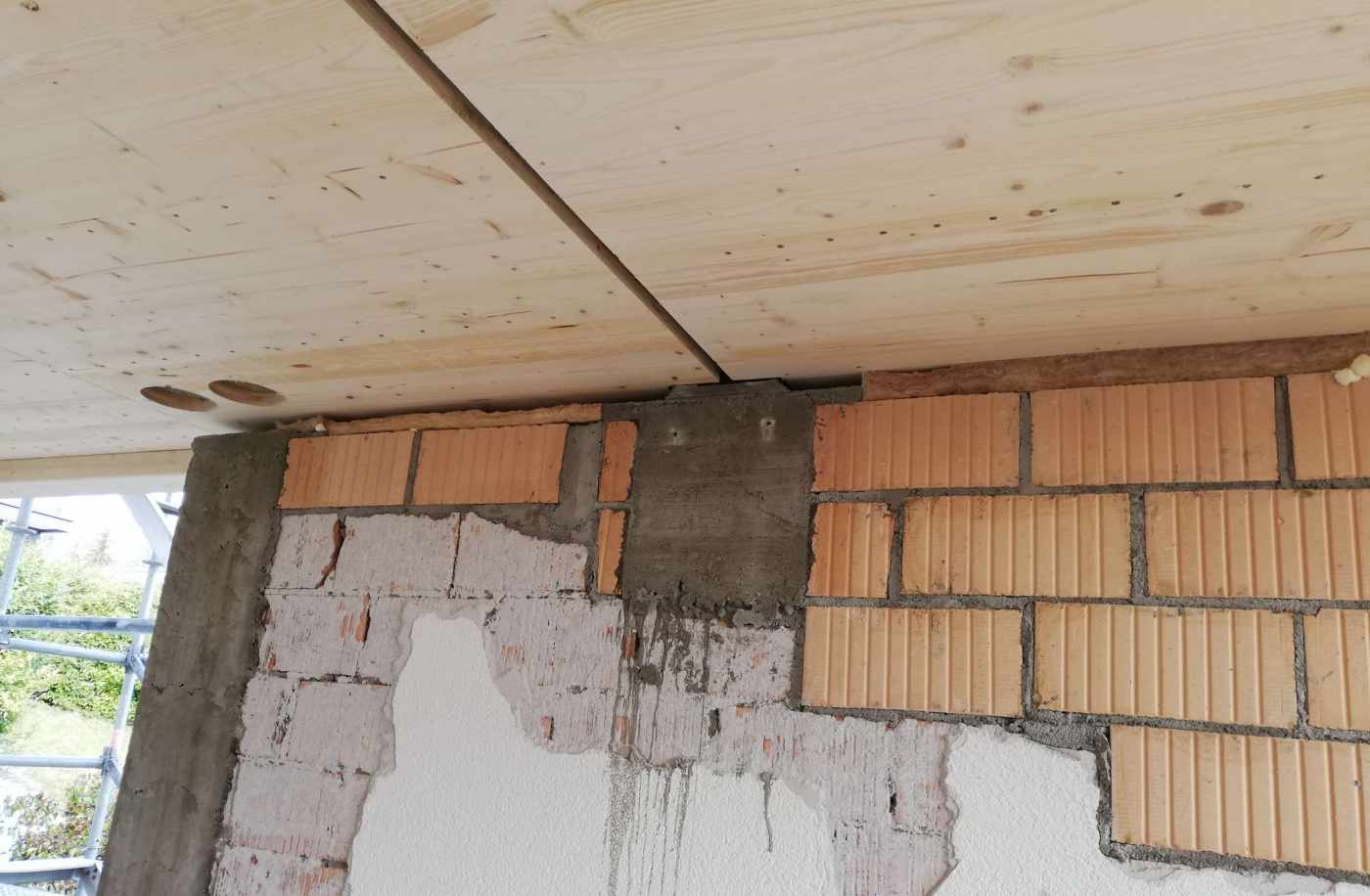 Das bestehende Dach wurde abgebrochen und die schrägen Wände neu ergänzt. Die neue Decke wurde in Holzbauweise realisiert und ist für den sorgfältigen Lastabtrag auf die bestehende Bausubstanz zuständig. Darüber wurde das Dachgeschoss komplett in Holzbauweise errichtet. Um die Lasten der Aufstockung abtragen zu können, wurden lokal die Geschosse darunter und die Fundation verstärkt. Aufgrund der schwachen, bestehenden Betondecken in den unteren Geschossen, durften die meisten Wände keine Mehrbelastung erfahren. Zweischalenmauerwerke, schwache Decken und grosse Fenster verlangten vom neuen Holzbau sorgfältig entwickelte Anschlüsse und Details.