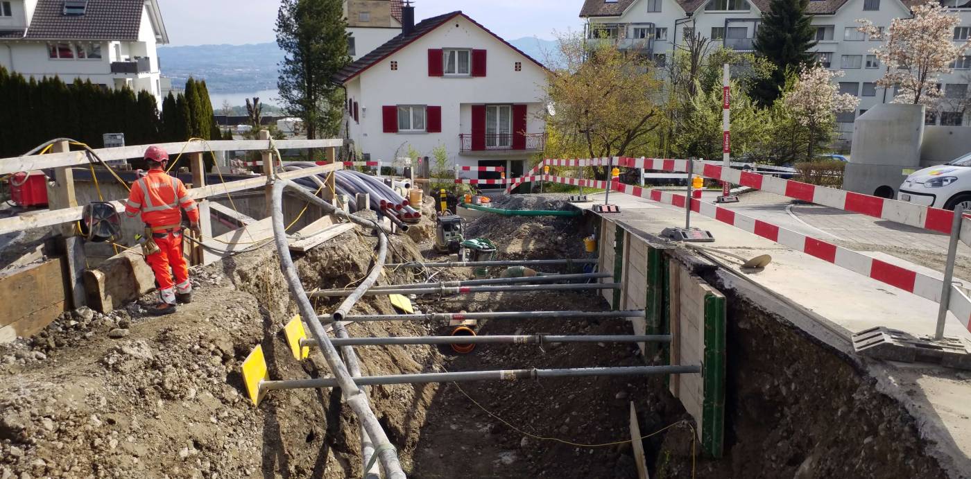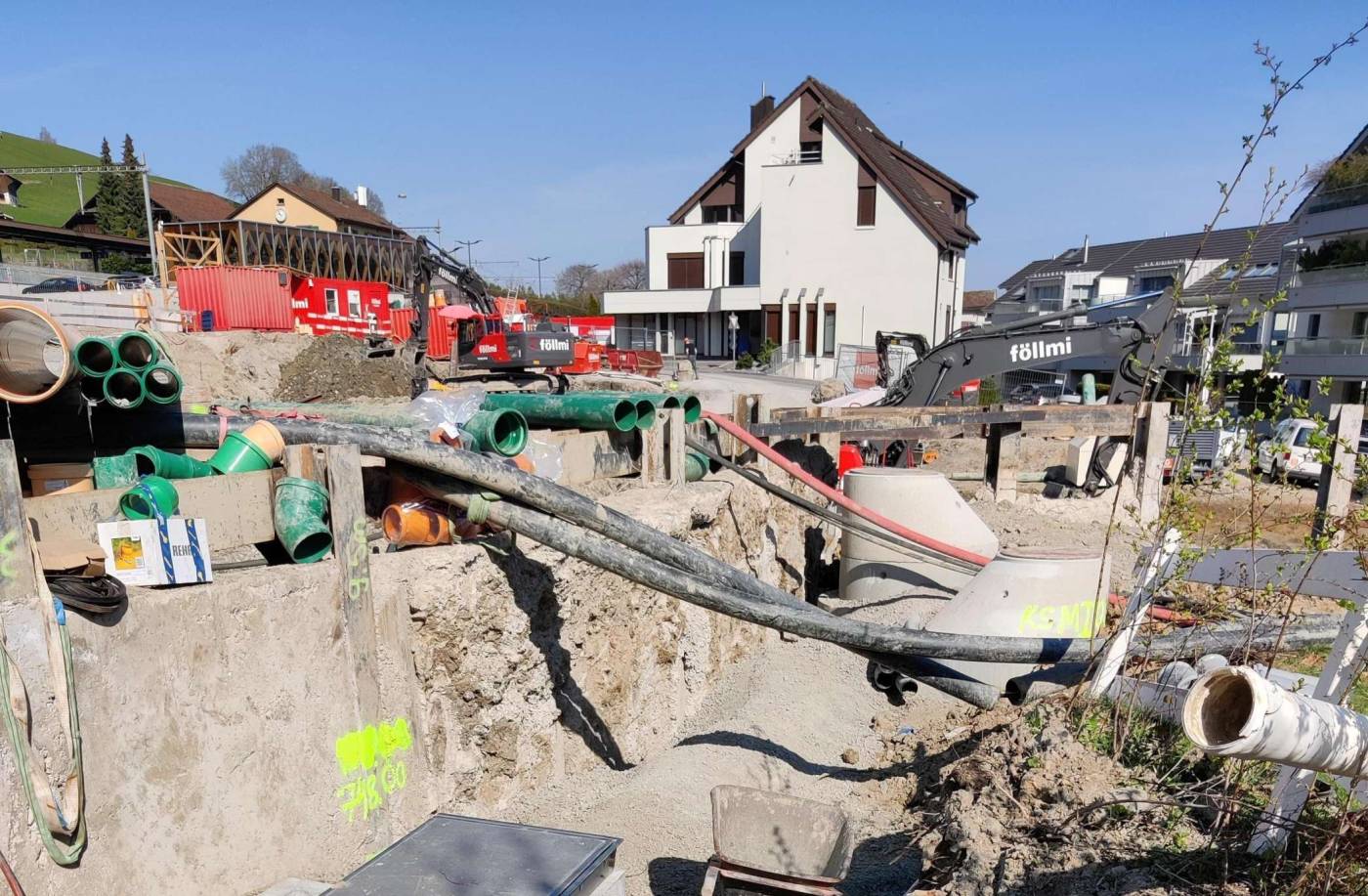 Im Zentrum von Schindellegi vis à vis vom Bahnhof wurden 3 Mehrfamilienhäuser erstellt. Im Bereich des Bauareals befinden sich diverse kommunale Abwasser-, Gas-, Elektrizitäts-, Wasser und TV-Leitungen. Im Auftrag der Gemeinde und in enger Absprache mit den Planern des Hochbauprojektes sind diverse Umlegungsvarianten studiert worden. Im Jahre 2021 wurden die Tief- zusammen mit den Hochbauarbeiten ausgeführt. Eine grosse Herausforderung waren die engen Platzverhältnisse zwischen den Rühlwänden und den Nachbargrundstücken. Durch optimale Koordination mit den Hoch- und mit den Tiefbauarbeiten konnten diese Probleme gut gelöst werden