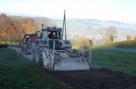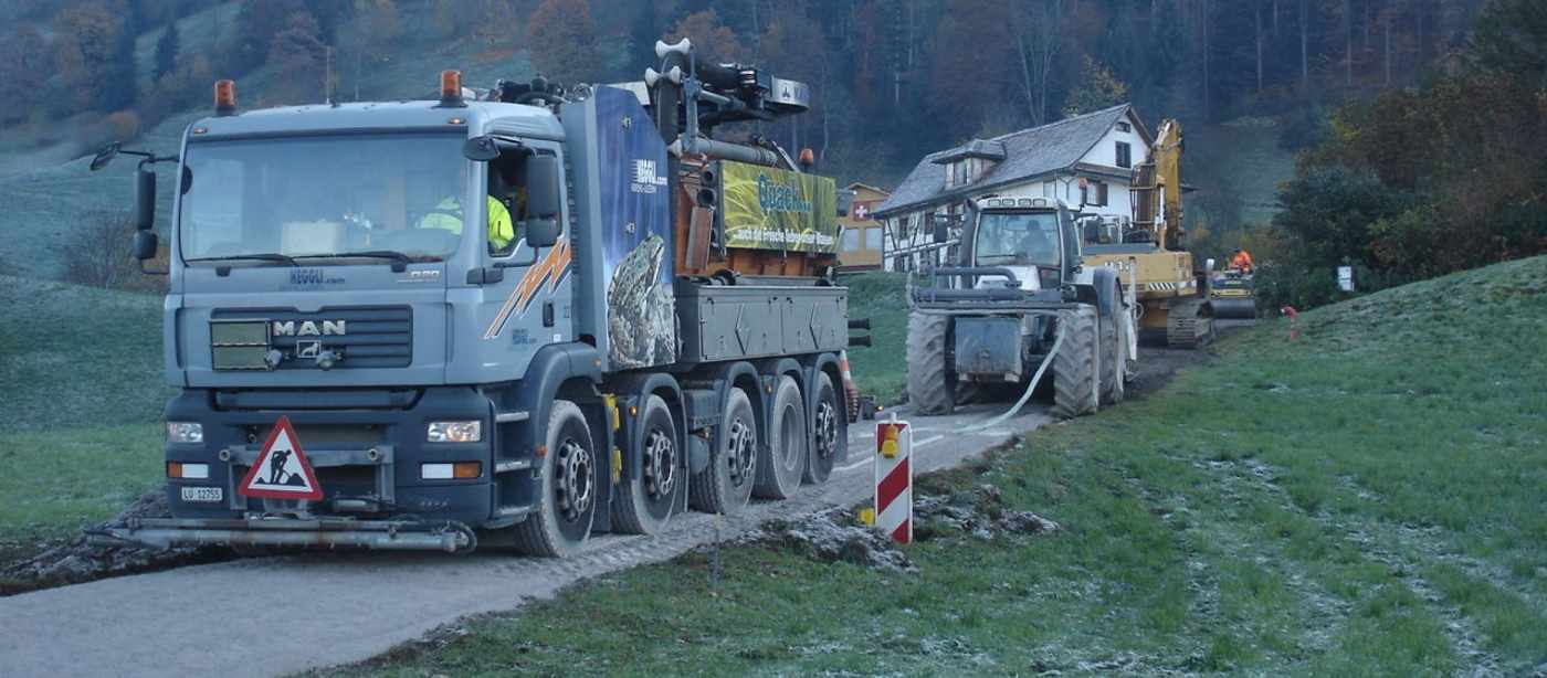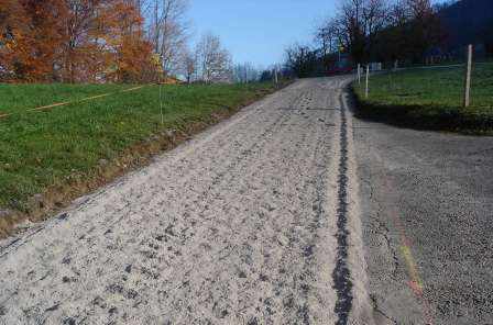 Der Rigiweg in Greppen ist eine Erschliessungsstrasse zu einzelnen Bauernhöfen und Gebäuden. Statt einer konventionellen Oberbausanierung wurde aus Kostengründen, Verkehrsbehinderungen, Bauzeit und Vollsperrungszeiten eine Sanierung mit Zementstabilisierung gewählt. Innert 1 ½ Tagen wurden die obersten 30 cm (inkl. Belag) der ca. 1700 m2 gefräst und unter Wasserbeigabe mit Zement gemischt. Anschliessend wurde in zwei weiteren Tagen die Feinplanie erstellt und ein einschichtiger Belag eingebaut.